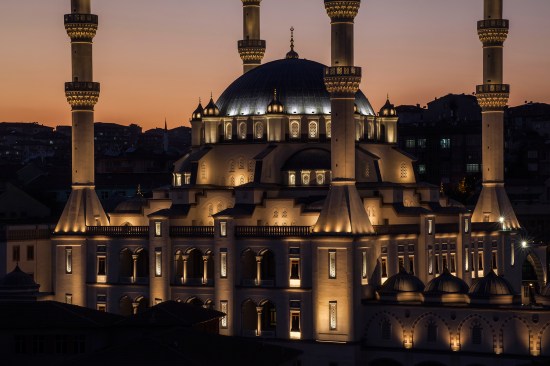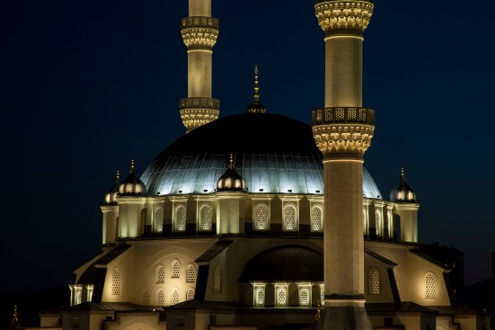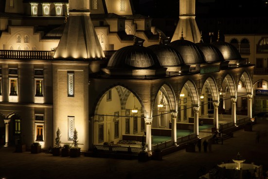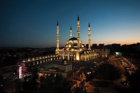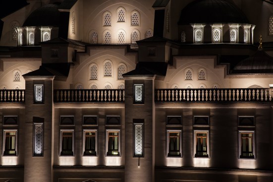 In order to make this place of worship a focal point for the city, the design team from Istanbul-based Zeve Lighting chose an illumination strategy that emphasizes the depth of the mosque’s architectural features, using a variety of color temperatures to establish a visual hierarchy on its surfaces. The interplay between light and shadow assists in that overall effect, with half-domes in shadow and patterned windows lit by narrow-beam uplight. Cool-white light washes the curves of the central dome, while warm-white light adds linear definition to the undersides of the minaret balconies and the crescent at the dome’s apex. Cool-white fixtures embedded into niches in the minarets illuminate the rectangular windows.