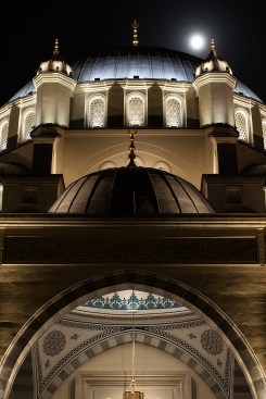 Project: Kırıkkale Merkez Nur Mosque, Kırıkkale, Turkey • Client: Turkiye Diyanet Foundation, Kırıkkale, Turkey • Architect: Necip Dinç, Istanbul • Lighting Designer: Zeve Lighting, Istanbul • Team Members: Ayrim Yaser Talu and Kenan Akifoglu, 3D Visualization Artist • Project Coordinator: Bekir Gerek, Kırıkkale Provincial Mufti • Photographer: Idris Ekinci • Project Size: Total lighting area is approximately 7,040 square meters (75,778 square feet). The building is 2,450 square meters (26,371 square feet). Height of main dome from the ground is 32 meters (105 feet); height of minarets is 61 meters (200 feet), and inner diameter of the dome is 20 meters (66 feet) • Project Cost: €11.6 million ($12.7 million) • Lighting Costs: €135,000 ($148,000) • Watts per Square Meter: 2.07, Total Power 14.6kW • Code Compliance: Not Applicable • Manufacturer: Philips Color Kinetics