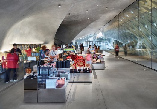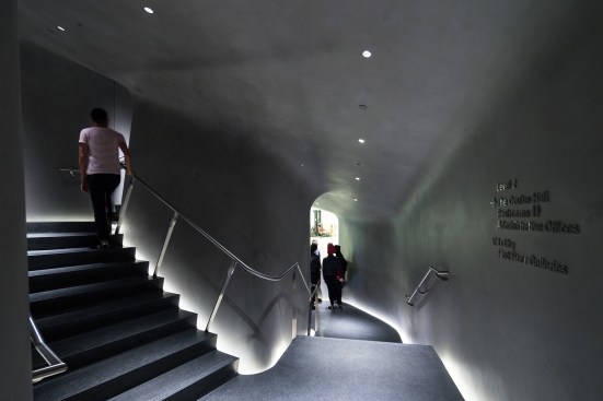 At the street-level corners, the veil lifts to form the entrances, which are uplit with in-grade perimeter halogen fixtures outfitted with shutters to precisely light the canopies. Beneath the veil, the charcoal-colored mass of the vault rises from the ground to cantilever over the lobby and museum shop (this page). Recessed ports with flush-mounted fixtures provide subtle illumination for the ground-floor lobby without disturbing its smooth plastered ceiling. The vault’s cave-like underbelly is interrupted by cylindrical escalator shafts, a winding staircase bracketed with linear LED striplights in a perimeter cove, and a luminous-floored glass elevator that emerges into the third-floor gallery.