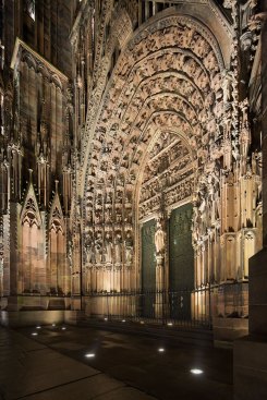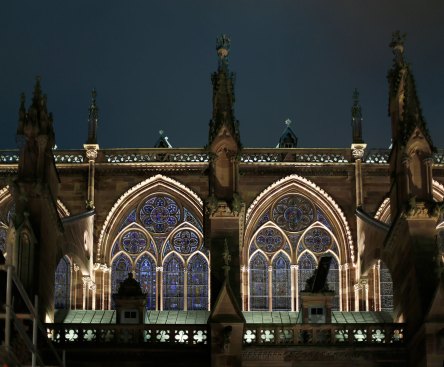 Project: Strasbourg Cathedral, Strasbourg, France • Client: City of Strasbourg, France • Lighting Designer: Jean-Yves Soëtinck, L’Acte Lumière, Strasbourg, France • Electrical Engineer: Lollier Ingénierie, Mittelschaeffolsheim, France • Conservation Architect: L’Atelier d’Architecture JCBA, Strasbourg, France • Photographers: Xavier Boymond, Olivier Hannauer Cappiello, Mélanie Lhomme • Project Size: 64,583 square feet • Project Cost: approx. $2.27 million• Lighting Cost: approx. $1.5 million • Watts per Square Foot/Code Compliance: Not Applicable • Manufacturers: Lumenpulse, Louss, Insta, Radiant, We-ef