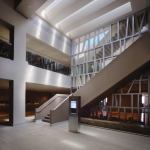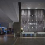 At the elevator banks in the background, backlit resin bands emi… At the elevator banks in the background, backlit resin bands emit a saturated blue light and serve as indicator lights for the elevators. As the elevators move the light changes from white—an indicator of the cab’s location—to blue.