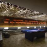 At the pool niche, flexible LED fixtures are mounted to coordina… At the pool niche, flexible LED fixtures are mounted to coordinate with the perforated corten panels on the ceiling and walls.