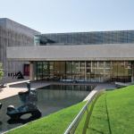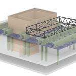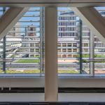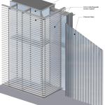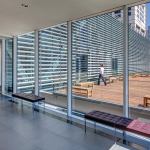 The rooftop addition rests on six concrete structural columns in the existing building, bridging the gaps between them with steel trusses. The architects punched through one of Saarinen’s concrete ceiling coffers to accommodate a channel-glass-enclosed elevator shaft, which connects the new 112-seat theater to the existing lobby. Aluminum screens prevent excessive heat gain and break up the addition’s mass. Clad in glass, the orthogonal building corresponds to Saarinen’s midcentury aesthetic beneath it. Now there are three main horizontal registers: Saarinen’s hulking concrete entablature, with the original glass curtainwall lobby directly underneath, and the new glass addition above.