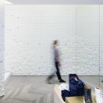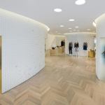 Leong Leong’s design incorporates a 65-foot façade clad in pillowlike concrete tiles. Thickest at the base, the profile of these tiles slims as they reach the roofline, creating the effect of the building fading into the sky. The interior is a sequence of spaces framing the clothing with a lining of tactile materials. Custom wallpaper—inspired by ancient Korean ceramics—was created in collaboration with artist Wook Kim. Other wall treatments include acoustical foam panels (extruded into cones) and peppered with a constellation of brass stars, leather herringbone tiles, and an oak floor that slowly transitions through a gradient of gray tones, all of which resonated with jury members. “I find it really remarkably restrained … and very intelligent about the use of materials,” juror Donna Robertson said.