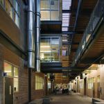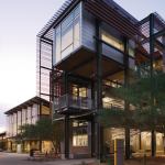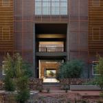 Lake|Flato Architects — Three new academic buildings on the Arizona State University Polytechnic campus are configured around landscaped courtyards, and a series of covered walkways, building portals, and arcades strengthen the campus-wide pedestrian circulation network. Each building—constructed primarily of locally manufactured masonry, weathered corrugated-steel siding, and glass—embraces an open-air atrium, shaded by a perforated metal screen, that plays an important role in a hierarchy of interior/exterior spaces. These spaces blur the line between inside and out through their scale, sense of enclosure, and naturally tempered air. “It’s a very simple set of objects clad in different public spaces that are both places to circulate and places to hang out,” said Aaron Betsky, who thought it appropriate for the desert environment. Ellen Dunham-Jones added: “The degree of difficulty is high. Going from [the existing conditions] to a place that seems really inviting is quite a remarkable achievement.”