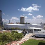The building’s resulting shape—defined by its angular, precast concrete and glass façade—looks as though the architect simply folded and creased the corners of a cube until it complied with the lines of the site. Cohen made use of extensive digital and physical modeling in order to create the façade, whose parabolic shape derives from 460 shaped, precast concrete panels. The façade is supported by an extensive steel structure, which integrates the mechanical systems.