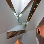 Cohen built the individual galleries around a central “lightfall”—an 87-foot-tall winding atrium—the construction of which also required parabolic modeling. Stairs, escalators, and elevators convey visitors through the stacked, independent galleries, with circulation paths leading back to and around the lightfall at every level.