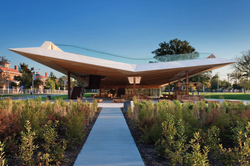 Located in the Congress Heights neighborhood of D.C., across the Anacostia River from the pageantry of the National Mall, St. Elizabeths is the site of a Civil War–era psychiatric hospital. The pastoral East Campus is now slated for development into a mixed-use community, and the East Gateway Pavilion is the first move to bring vibrant activity back to the site. Designed by the Washington, D.C., office of Davis Brody Bond, the 16,000-square-foot pavilion has dining spaces, a community roof, and a market, and hosts cultural events in the district. The steel-frame structure’s butterfly roof, edged in 184 high-performance concrete panels, doubles as shelter for the open-air market below and occupiable green space for visitors, and boasts an overlook point for the campus, which is listed in the National Register of Historic Places.