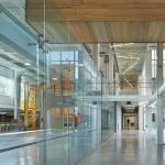 Steel members and mechanical systems are left exposed throughout. The structural and hydraulics labs—which are enclosed in glass so that students can observe experiments even when not in class—are more than 30 feet high, and equipped with gantry cranes. These rooms use thermal-displacement ventilation, so little of the volume of the room is actively conditioned.