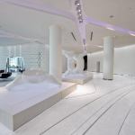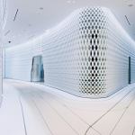 Asymptote Architecture • “It’s totally sci-fi,” said Yolande Daniels, summing up the project that had the jury feeling futuristic. The Yas Hotel in Abu Dhabi, United Arab Emirates, is at the cutting edge of both form and technology, with a weblike shade structure that cloaks the hotel’s two 10-story elliptical-shaped towers. The 500-room, 900,000-square-foot hotel straddles the Yas Marina Circuit Formula One race track, its two towers knit together by a steel bridge. The team at Asymptote Architecture designed the exterior steel-and-glass latticework, which it calls a gridshell, to mirror and capture the speed, streamlined form, and dynamic energy of Formula One racing. Inside the lobby, the expertly detailed all-white hotel resembles at once an ocean liner and an icy glacial formation.
