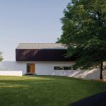 The ground floor links the main house and garage in an L-shaped plan—brick at the entry side and glass facing the water—that acts as a gateway between the pine forest and the shore. The building’s most striking feature is the second floor, a copper-clad form that reads as a completely independent object perched atop the ground floor. Trapezoidal in section, the resulting volume creates appealingly eccentric interior spaces. Glazed, recessed end walls orient toward view corridors through the trees to the lake.
