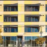 A lobby canopy and deep shaded balconies reinforce the residential scale of the south-facing quieter street, while the volume along the western arterial edge reads as a wall punctuated by geometric solar shades. Both are covered in integrally colored cement-panel rainscreens abstractly composed in three shades of yellow.