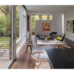 There also is no wasted space. The rooftop holds a 1,100-square-foot deck, which is reached via a lithe steel stair that hangs off the side of the building. “We didn’t want to eat up interior space with a long stair,” Gurney says. “It’s a nice experience going out of the house, up the stairs, back into the building, and up to the roof.” Layered sections of mahogany and charcoal-colored block walls define the entry sequence and establish a rhythm from the street. Inside, dark walnut flooring and white walls provide a canvas for the furnishings.