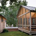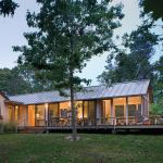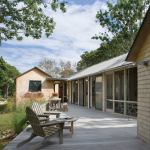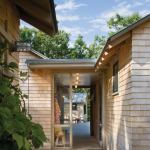 Rather than string the buildings along in a straight line, Estes arranged them around the site’s best feature, a grassy, tree-ringed area that faces northwest. “By cocking the angle, we were able to enclose the sweet spot and give the house more privacy,” he says. “The angle makes it more interesting.” Unadorned detailing throughout the project—such as 2x4s used as rafter tails, a sliding barn door on the street-facing shed, and standing seam metal roofs—suits the home’s low-key demeanor. “It’s no-nonsense,” said a judge approvingly.