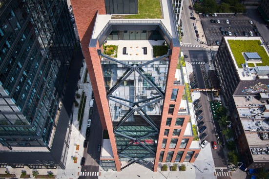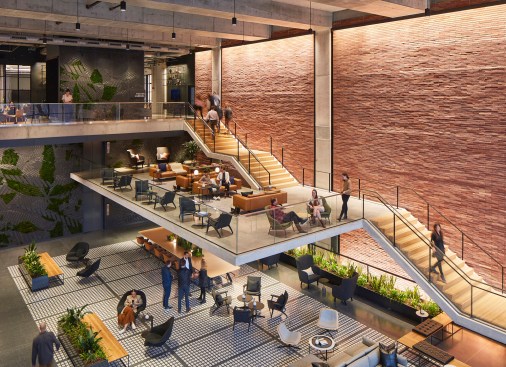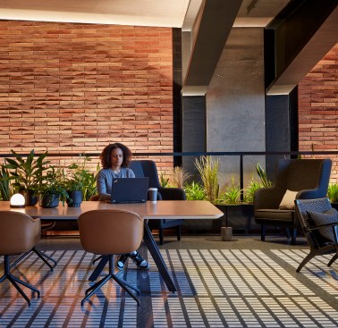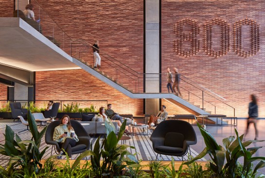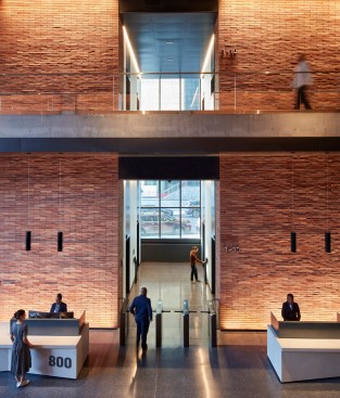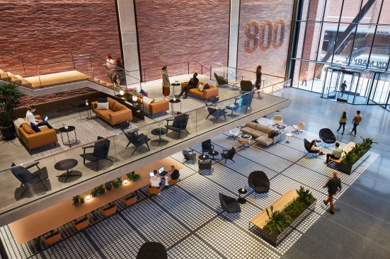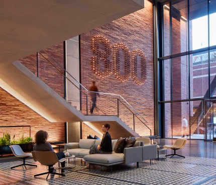 The industrial roots of Chicago’s Fulton Market District offered plenty of inspiration for the brick- and steel-forward design of 800 W. Fulton, a new mixed-use building by locally headquartered SOM. Masterminded by fellow Chicagoans at Schuler Shook, the structure’s lighting scheme responds in kind, calling on a medley of strategies to complement SOM’s carefully implemented material palette and architecture. In the pendant-lit lobby, for instance, grazers help celebrate the height of the nearly 40-foot ceiling and draw attention to the detailing on the back wall, where bricks jut out to form the building’s address number. Meanwhile, concealed uplights exude a soft glow beneath the lobby’s concrete mezzanine, accessed by a cantilevered staircase.