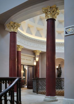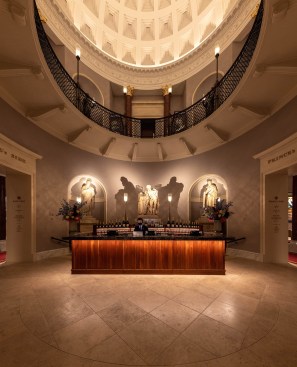 That’s not to say the project doesn’t feature some modern touches. New concealed fixtures help wash ceilings and illuminate artwork, while pendants updated with what the designers describe as “pencil-thin, narrow beam optics” ensure that each seat has adequate light for theatergoers to read a program. Per the request of composer Andrew Lloyd Webber, who financed the renovation, the team also installed low-level LEDs along the staircase to mimic the appearance of candlelight.