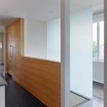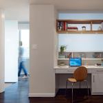 Feldman and Lougee expanded the kitchen, losing a bedroom and full bath in the process, but gaining a breakfast nook and a built-in desk. Frosted glass behind the desk allows light to filter through. Lighter finishes and modern appliances help bring contemporary panache to the new, open-plan kitchen while still respecting the home’s midcentury heritage.