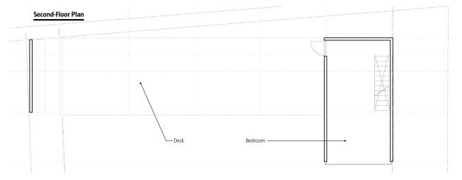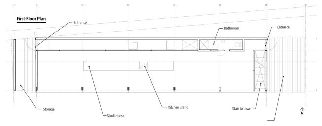The timber structure is clad in concrete panels and aluminum grating. A grated-aluminum deck extending from the house toward the horizon is bisected by vertical sheets of glass framed by 2×8 studs. These transparent layers are aligned to create a slotted view to the sea. The jurors admired the embrace of industrial materials and the radical pragmatism of its undefined, multipurpose interior spaces. Juror Joseph Rosa saw its simple typology as an escape from everyday cluttered existence. “It harkens back to the classic houses by [Marcel] Breuer and [Walter] Gropius,” he said. “You just turn the key and go in.”