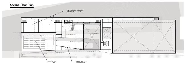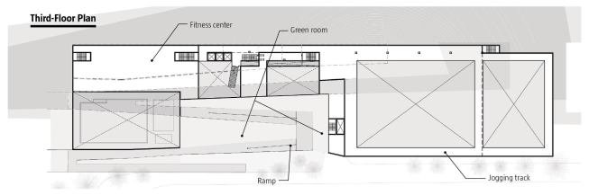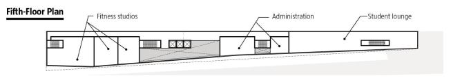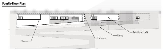 The jurors emphasized the project’s positive urban contributions, which—predicted juror Ann Beha—“will make a huge difference in this place.” At the street level at the top of the sloped site, the building reads as only a two-story volume, containing a lobby, a retail café, and fitness studios. At this level, the bar structure more than a block long is visually divided in the irregular rhythm of the former storefronts. Gyms, pool, and related facilities are recessed into the slope. Green roofs, which are accessible to the public, cover the volumes embedded in the hillside. Juror Mary-Ann Ray appreciated that all of this was achieved without altering the scale of the neighborhood. “It brings a historical neighborhood into the 21st century in a way. It sort of modernizes the city.”