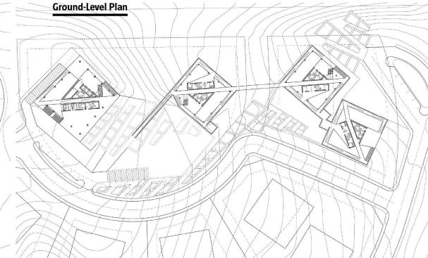 Cohen interrupts this uniformity with a single horizontal datum, seemingly suspended in air, which penetrates each building at a different elevation relative to where it sits on the slope. Programmatically, the view line forms a ramped corridor, which splits the main core of each tower diagonally as it rises to match the topography. Juror Dan Rockhill was impressed with the overall continuity, which is both visual (sight lines) and spatial (internal ramps). “It’s quite inventive, just in the minimal quality of it. It’s quite striking,” he said.