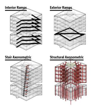 The fire stairs, while providing code-compliant egress, act as a strong vertical counterbalance to the horizontal ramp datum that splits the cores of all four buildings diagonally. One stair is enclosed in a typical rectangular stairwell. The other forms a triangle in a twisting vertical shaft, open to a central void. The result is staggered floor heights on either side of the core. Space can be leased as half-floors or as full floor plates connected by ramps.