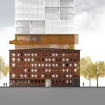 Solution Montreal-based Saucier + Perrotte Architectes reused a historic building as the base for a glass-enclosed tower. The existing building’s walls are perforated to incorporate a new hotel within its volume. Residential apartments are located in the tower, which is broken up in five-story increments by recessed terraces. The curtainwall increases in reflectivity as it rises to become more ephemeral. “It’s a bold engagement with an existing vernacular building,” juror Ann Beha said. “I think with a building like that you should feel … [that] it’s a massive, powerful building that was there and you should feel you can make a response that’s equally robust.” The contrast resonated with several jurors. “What I think is really great about this is it’s completely, uncompromisingly different,” juror Cathy Simon said. “It’s not just different materials, but it’s [a] different view of the contemporary.”
