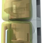 The nodes are manufactured in a factory and then brought to the site and installed on the foundation. Each is structured like an onion, in layers, with a central spine that contains all utilities, including plumbing, electrical, and HVAC. When the pods are stacked, the utilities can be run together, like the plumbing in upstairs and downstairs bathrooms in a conventional house. The central core is enveloped by an inner liner of molded fiberglass, which determines the use of the space. A layer of insulation is added, followed by the outer fiberglass shell. The result is a standardized and compact volume that is as sleek as an iPod.