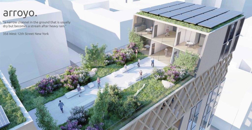 Designed by Vangel Kukov and Hala El Khorazaty, the conceptual project transforms the site of a current industrial building in the West Village of Manhattan, one of New York City’s most expensive neighborhoods, into a multi-generational, multi-cultural residential and civic hub that builds and strengthens community. Dubbed “Arroyo,” a Spanish word meaning a dry channel that becomes a stream after rain, the winning project symbolizes the transformation of a lifeless space into one that flourishes with energy, activity, and human connectivity.