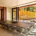 “We pictured the composition as two hands spread far apart, containing this whole site but not devouring it,” Ashley says. The low-slung buildings appear as bookends connected by an aspen allee and a raised boardwalk that threads through a gravel sculpture garden. Separating the project into smaller components allowed it to be built without code adjustments, as did the choice of natural materials that blend with the wooded surroundings. The buildings are made of board-formed concrete, with sapele mahogany used on the overhangs and as a rainscreen on non-bearing walls. Roofs are post-tensioned concrete slabs supported by exposed steel columns on the inside and outside. Interior walls feature rough or sawn concrete and wood paneling, and the polished ground-concrete aggregate floors resemble terrazzo.