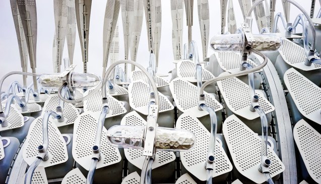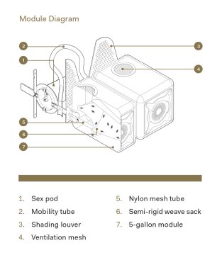 The 144-square-foot structure comprises 224 interconnected modules set within a vault of 16 CNC-milled wood ribs. Each module consists of a 5-gallon plastic container lined with a nylon mesh sac and equipped with a ventilated door, a shading louver, and “mobility tubes” that lead to other modules. These 0.5-inch-diameter PVC tubes are lined with soft nylon mesh. Cocoon-like “sex pods” affixed to the outside of the shelter make mating a potential spectacle. Once the baby crickets, or nymphs, are strong enough, they can hop freely into the main farm via the tubes.