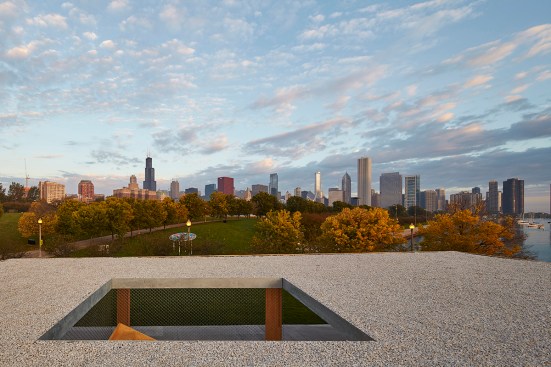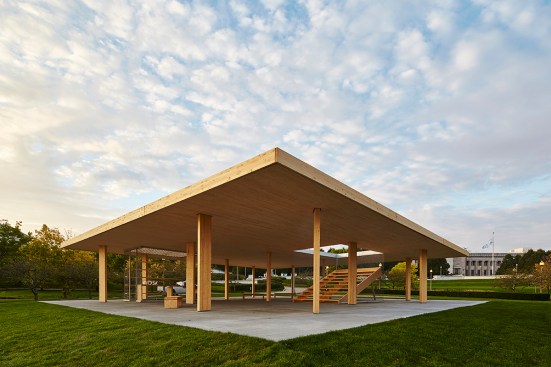 This open timber pavilion with an overhanging roof was named the winning design of the Lakefront Kiosk Competition in 2015. Completed last October in Grant Park for the Chicago Architecture Biennial, Chicago Horizon has a square, flat canopy measuring 56 feet on each side—the maximum length of timber that can be legally carried by a truck.