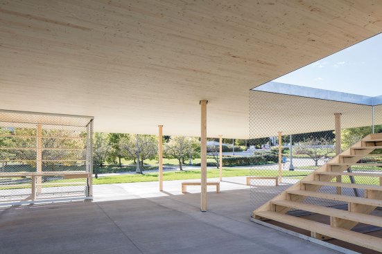 The roof is the first point-supported, two-way slab structure to be built with timber, according to the design team members, Ultramoderne co-principals Aaron Forrest, AIA, and Yasmin Vobis, who are based in Providence, R.I., and structural engineer Brett Schneider, a senior associate at Guy Nordenson and Associates in New York.