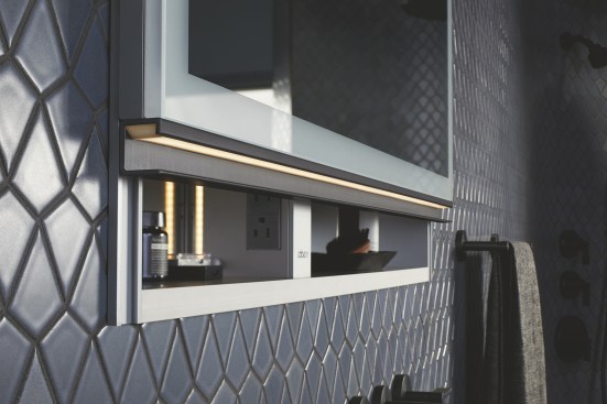 An update to an existing product, the cabinet features an illuminated, upward sliding mirror, defogging, cantilevered glass shelving, tamper-resistant outlets, integrated USB ports, and several handle finishes, including chrome and matte black. It also offers up to three light sources: the perimeter band of dimmable LEDs, which emanate a warm 2700K glow; a night light along the bottom handle; and illumination for the cabinet interior that switches on when the mirror is lifted.