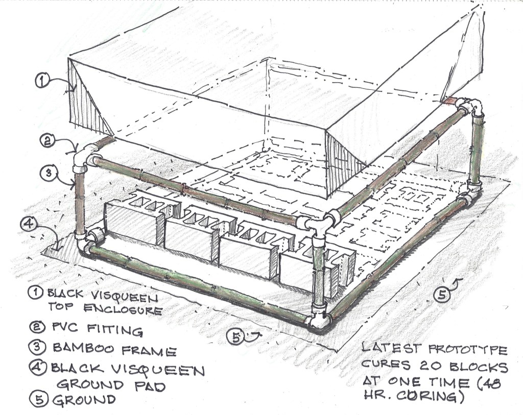 Costello’s solution to these structural issues is two-fold: First, he invented an easy-to-build kiln—powered by passive solar energy—to dry concrete masonry units made from a lightweight frame with a black polyethylene cover. Temperatures inside the kiln can reach 140 F, enough to cure the concrete bricks inside. He plans to build a full-scale version in Haiti this summer, and then begin training local artisans to use it.