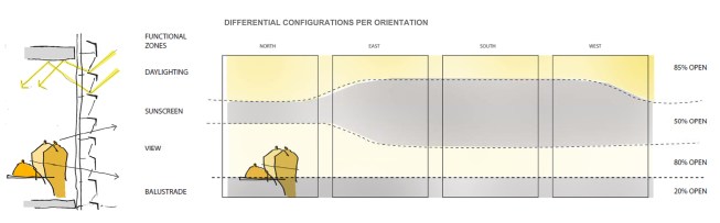 The solution was the development of a shading system that could pull double duty as a cooling mechanism and as a visual break in the building mass—and be lightweight enough to be installed on the façade with minimal structural support.