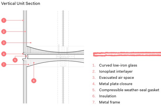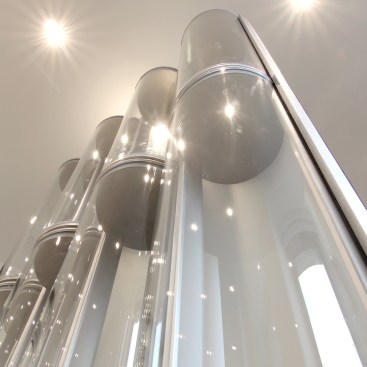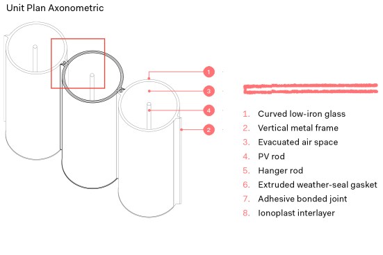 The tubes, stacked one beside the next, have structural qualities—they are self-supporting in heights of up to 15 feet—and, when vacuum-sealed and combined into a façade system, they offer an R-value comparable to that of a solid, insulated wall, despite being fully glazed. This is a big advantage considering that glazed surfaces are the single biggest site for heat loss and gain in a building. The aesthetic solution also answered a host of energy retention problems, and “pretty soon we were thinking of it as a whole system,” he says.