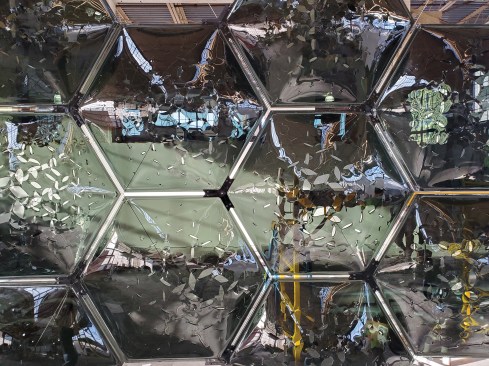 The resulting artifact comprises 64 hexagonal slumped glass pieces arranged in two layers of 32 panels. The manipulation of the glass from flat to increasingly slumped and perforated at the opposite end creates a gradient across the piece from reflection to diffusion to absorption to transmission.