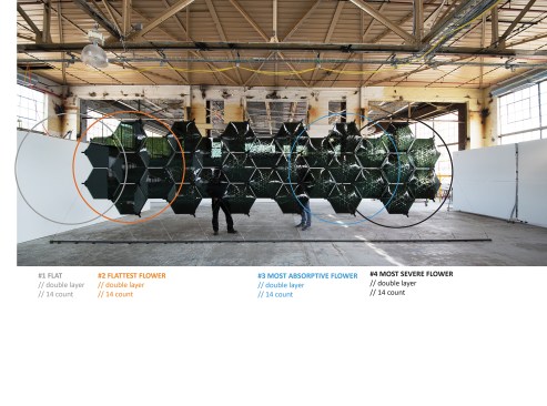 The work was developed over three phases of research. The first inquired about material and process, creating fabrication methods for the controlled slumping of double-layered hexagonal glass panels. Each panel can be perforated with auxetic patterns that vary the acoustic properties. The second phase investigated the acoustic behavior of the components in aggregate using wave-based computational simulations at varying scales, including room-scale. The third looked at surface dimensions, behavioral extents, and the system of assembly for actual implementation. The scale of the geometric modifications to the base flat panel is varied across the surfaces, with the most aggressive manipulation creating deeply curved surfaces and porous openings. This aesthetic complexity creates distinctive visual forms that match the increasingly unusual acoustic properties of a typically straightforward material.