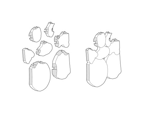 The digital cookies can then be sorted across a designed form and inscribed with a set of joints. Fabrication requires minimal part reduction with a five-axis waterjet, and CNC routing adds surface continuity across a patchwork of irregular structural blocks. The blocks are joined without binders or hardware, allowing for easy assembly, disassembly, and reuse. The system can be utilized on a wide range of large-scale architectural uses, including structural walls and vaults, as well as nonstructural and decorative uses.
