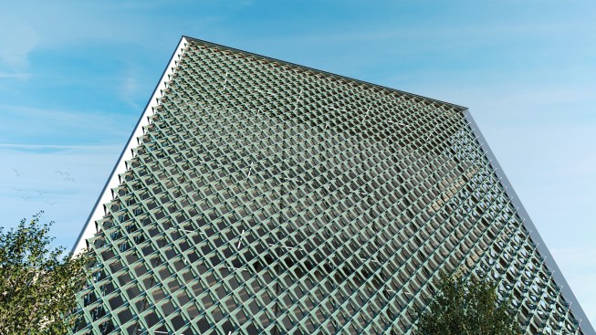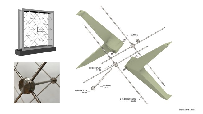 The V-Soleil system comprises interlocking V-shaped glazed terra-cotta modules measuring approximately 18 inches across that are supported on a double-layer tension net structure, creating a diamond-shaped screen. Depending on a faƧadeās solar orientation, the module can be rotated to optimize its shading capability.