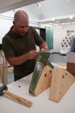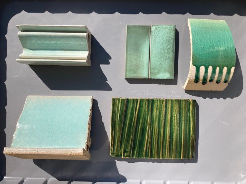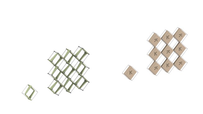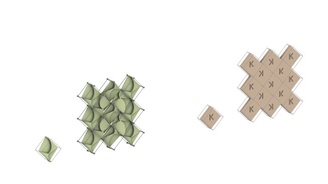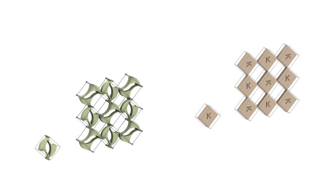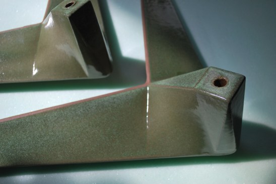 Each module is made of dark brown clay with green glazing. Portions of the clay are strategically exposed for an organic effect but also out of practicality: Due to the moduleās geometry, the designers had to consider how each would be supported during the firing and glazing process to avoid fusing to the kiln. Working with a glazing specialist, ARO developed a firing support that would intentionally leave selected surfaces unglazed, an important consideration given that each piece would be viewed in the round.