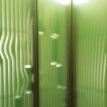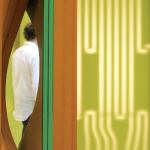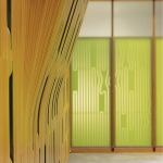 One of Columbia University’s newest facilities has a very specialized purpose: the storage and conservation of projection slides, a staple of art history and archaeology instruction. In this project, architects Marble Fairbanks created an enclosure for thousands of slide file drawers dominated by an undulating east wall of milled MDF panels and ½-inchthick glass, stacked vertically and threaded onto a series of supporting rods. The MDF panels were CNC milled in an on-campus workshop and are meticulously shaped so that the profiles combine to form a sinuous wall surface. At intervals, two sheets of glass are placed between the MDF panels on the threaded support system. This allows for light to shine through the width of the glass, adding visual texture. The other three walls are made up of MDF panels laminated with sheet linoleum and inscribed with the tooling paths of pieces in the east wall.