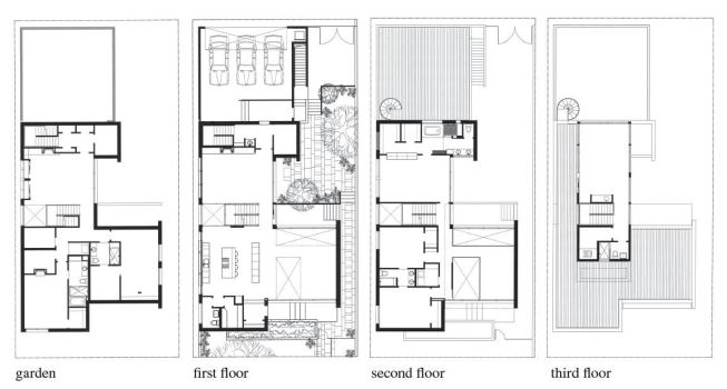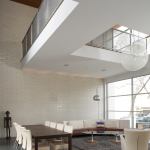 Peters clustered private spaces in the project’s masonry portion, while public rooms occupy an adjoining cedar-and-glass cube. “We tried to create the transparent cube so the house would be more inviting to the street,” he explains. “You’re able to see through the building to the back and see how the materials wrap around it.” The white ground-face masonry blocks cladding the private wing, for example, also cover the double-height living room wall. And the cedar cladding continues inside on the second-floor ceilings, then outside again to form a backyard canopy.