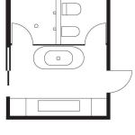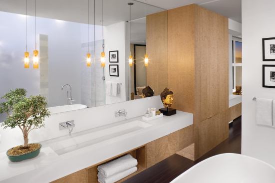 If the great room of Urban Living XXL is a courtyard, its master bath is a private walled garden. “This bathroom was positioned to be directly under the skylight,” says architect Brad Walker, AIA, LEED AP, who designed a splayed skylight shaft to light the windowless space. Reflective white fixtures and wall surfaces give the room a diffuse glow.