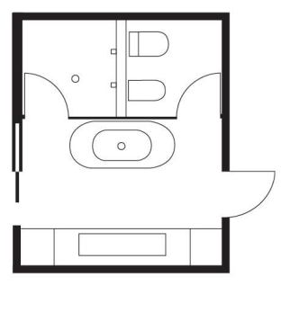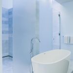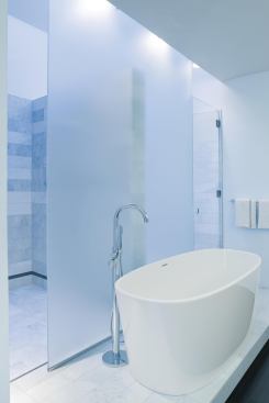With its pocket door open, the bath extends the visual theme of the master bedroom. Bird’s-eye maple cabinetry seamlessly bridges the two spaces, topped in the bath with a ghostly white, room-width counter of sanded acrylic with a Corian undermount sink. Opposite the counter and slightly elevated stands a porcelain vessel tub, behind which a ceiling-height panel of etched glass encloses twin marble-lined compartments for the shower and toilet. The plumbing had been roughed in before he took on the project, Walker explains. “We couldn’t move the locations of the shower and toilet drains, so we decided to take the wet area and put it up on this little, floating, white marble platform.”