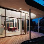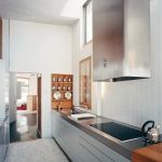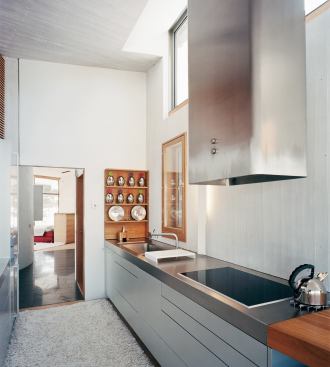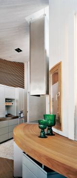 The look may be quiet, but the design certainly isn’t bashful. Cast-in-place concrete on the exterior wall and ceiling collaborate with the exposed wood framework to “create a receptive surface for the play of light,” says Helineva. A pale gray glaze minimizes the concrete’s heaviness. Brushed aluminum cabinet and drawer fronts also help lighten the mood, and thick oak countertops, window casings, and floors add warmth.