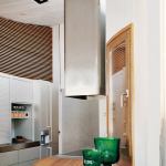 A bold, stainless steel range hood hangs mere inches from the wall and ceiling to create a sculptural effect—yet another nod to the tastes and habits of the homeowners, who collect art as a hobby. To keep the focus on the hood, the architects omitted upper cabinets in favor of lower cabinets that continue along the wall into the dining space, to function as furniture. Rolling shutters close off the countertop between the fridge and ovens to minimize clutter and keep the space at its simple, sleek best.