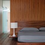 A walnut-surfaced millwork element presents opposite sides to th…
