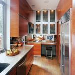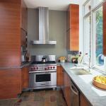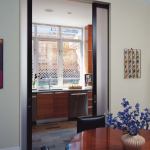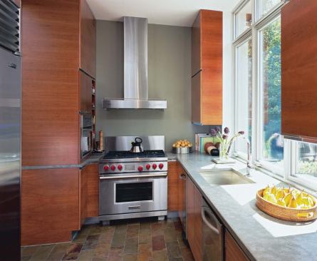 With its strong horizontal lines and clean details, the 18-foot-long kitchen is minimalist without appearing ultra-modern. Even a backsplash was deemed gratuitous; the aluminum window sits right on the countertop, which in turn slips between cabinetry under the microwave. “We liked the idea of the horizontal plane of counter not being stopped and connecting to the outside,” Bloomberg says. A cooking area to the left as you enter the kitchen now occupies the former powder room, which was moved to the stair landing. At the far end is a square bar sink and compact computer space with a flat-screen monitor mounted beneath wall cabinets. And an existing 4-foot-by-4-foot pantry is tucked behind a full-height cabinetry door, so you don’t know it’s there. “We wanted to keep everything very flush to make it look neat and clean, which is what the clients wanted,” Bloomberg says. The result is an unabashedly 21st century workspace, one with enough texture and warmth to span two time periods.