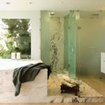 The same marble tops the cantilevered double vanity on which twin glass vessel sinks perch. “I use a floating vanity pretty often, because I like seeing the floor continue,” he explains. White lacquered custom cabinets provide a simple foil to the heavily veined marble above and the pillowed-oak floors below. In the shower, a 2-inch step-down in the marble platform prevents water from spilling over.
